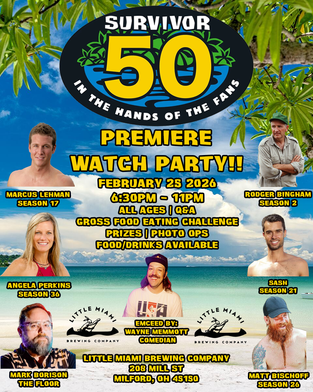 Get ready for the once in a lifetime Survivor 50 Premiere Viewing Party! Join us in person Wednesday February 25th in Milford, Ohio at Little Miami Brewing Company. Watch Survivor with former Survivor Cast members. Matt Bischoff from Survivor Caramoan, Rodger Bingham from Survivor Australian Outback, Angela Perkins from Survivor Ghost Island, Marcus Lehman from Survivor Gabon and Matthew “Sash” Lenahan from Survivor Nicaragua. Also Mark Borison from The Floor/Jungle Jims Podcast and Emceed by Cincinnati Stand up Comedian Wayne Memmott! This is an all ages event!