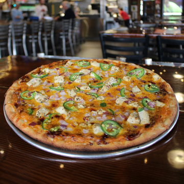 BBQ sauce base, monterey jack-cheddar, chicken, red onions, & jalapeños