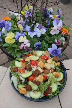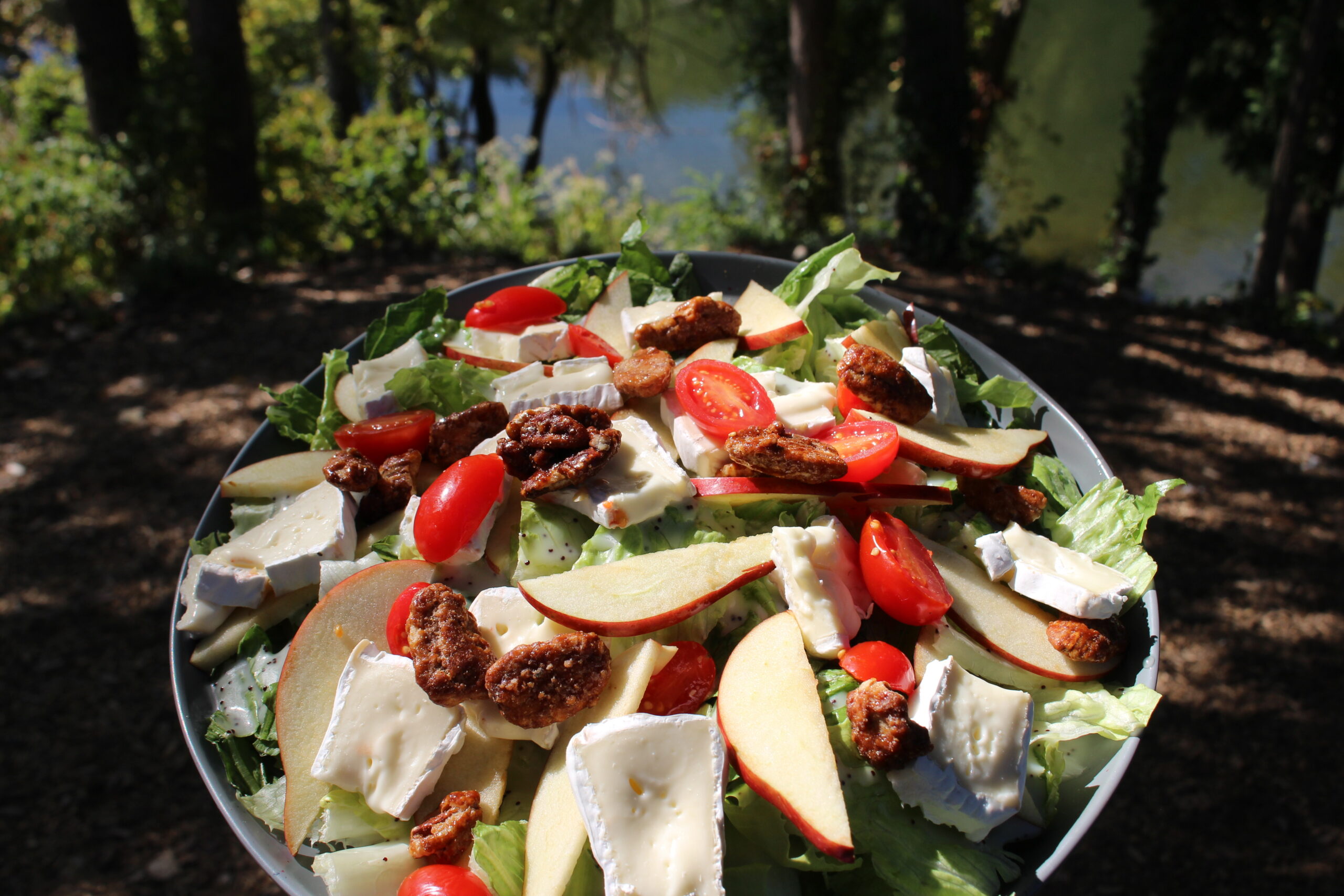 Romaine, Brie Cheese, Apples, Candied Pecans, Cherry Tomatoes, Honey Poppyseed Dressing.