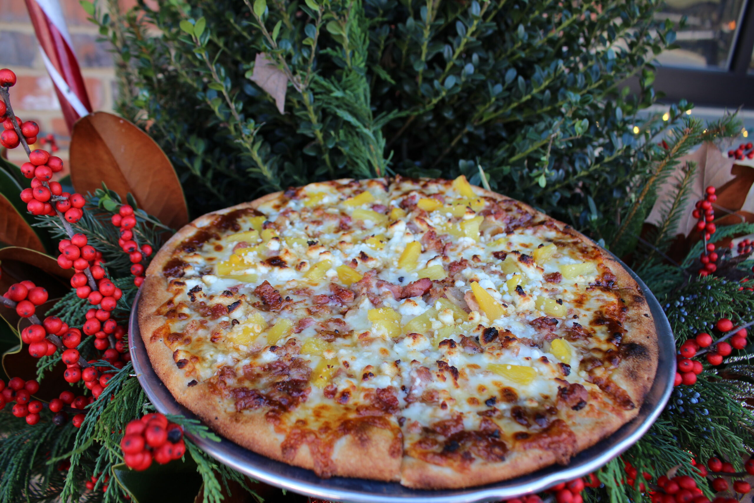 Fig Jam Base, Mozzarella, Goat Cheese, Bacon, Pineapple, and a drizzle of Hot Honey.