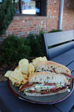 Telera roll, bacon, shredded lettuce, tomatoes, basil aioli. Served with kettle chips.