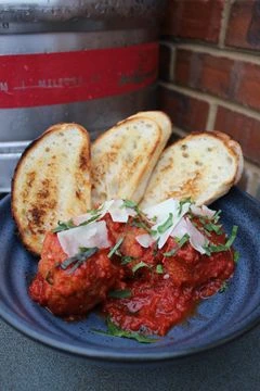 3 delicious meatballs covered in marinara sauce, basil & parmesan with a slice of garlic bread