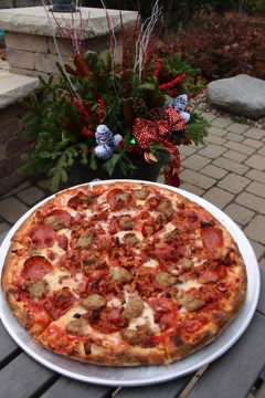 Red sauce base, mozzarella, pepperoni, sausage, banana peppers, toasted almonds