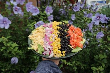 Romaine, red onion, corn, black beans, tomatoes, tortilla chips, & chipotle ranch dressing