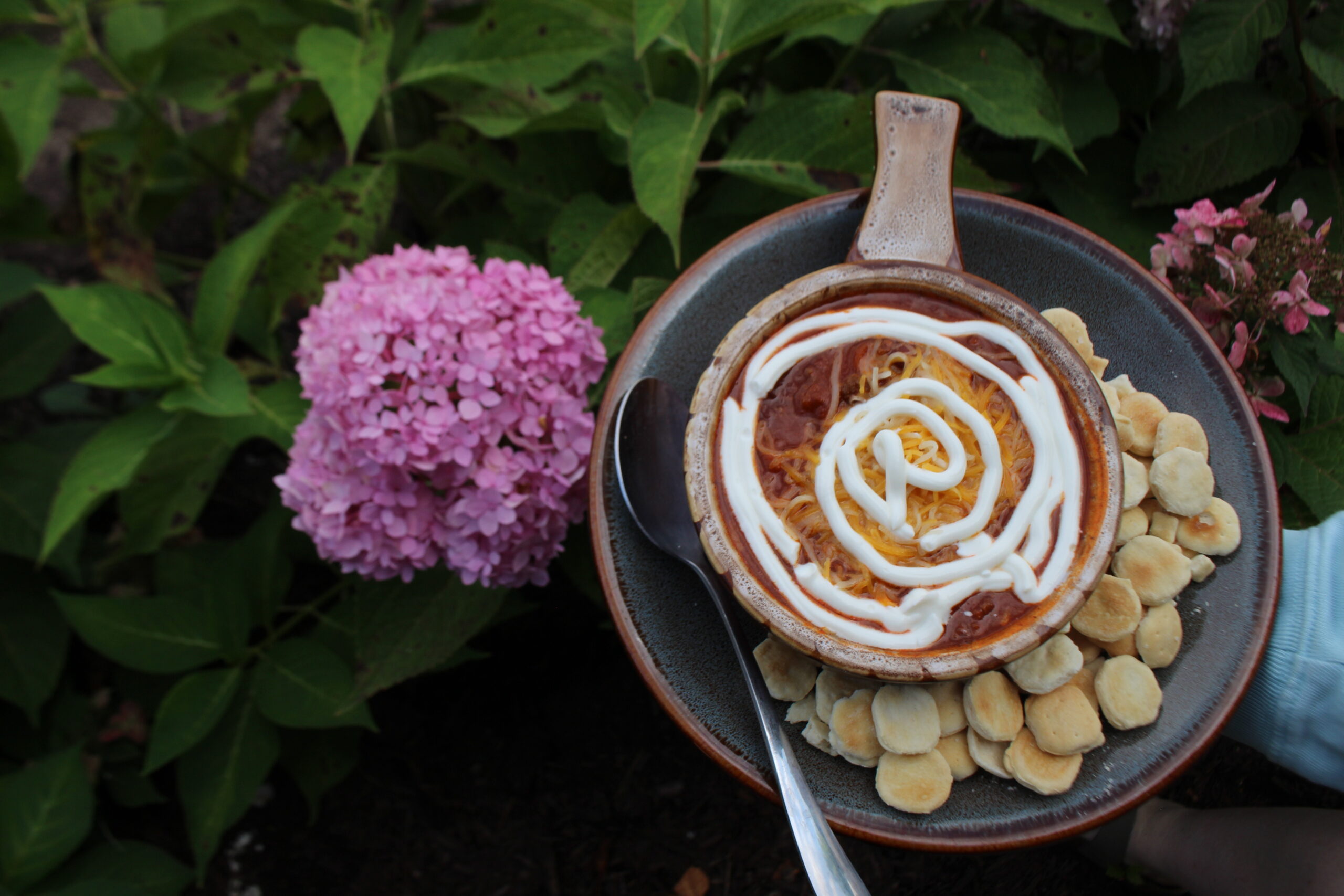 Classic chili garnished with cheese & sour cream. Served with oyster crackers