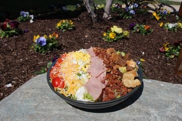 Romaine Lettuce, Monterey Jack cheese, ham, bacon, hard boiled eggs, cherry tomatoes, croutons, & Ranch